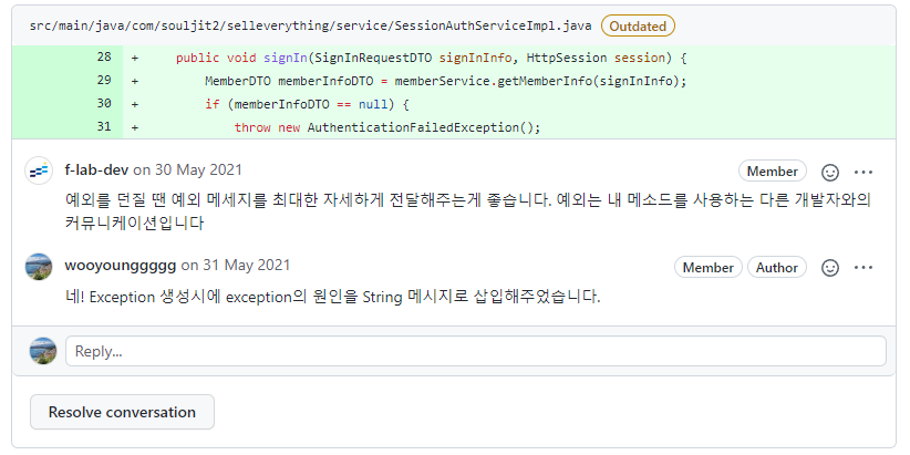아래는 Exception을 발생할 때, Exception 메시지를 자세하게 작성해야 한다는 멘토님의 코드 리뷰였습니다.